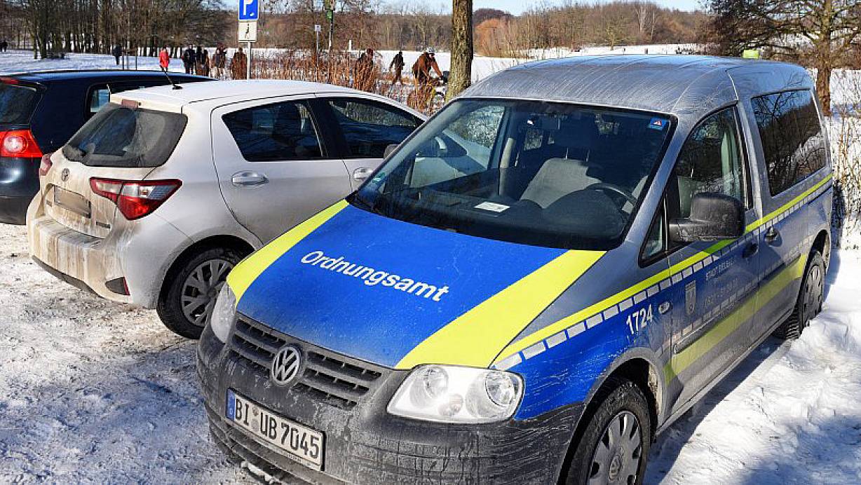 Ein Team vom Ordnungsamt holt am Samstag mehrere Eisläufer vom Obersee. Als die Crew zum Dienstschluss wieder auf den Parkplatz kommt, macht ihr VW Caddy einen luftlosen Eindruck.