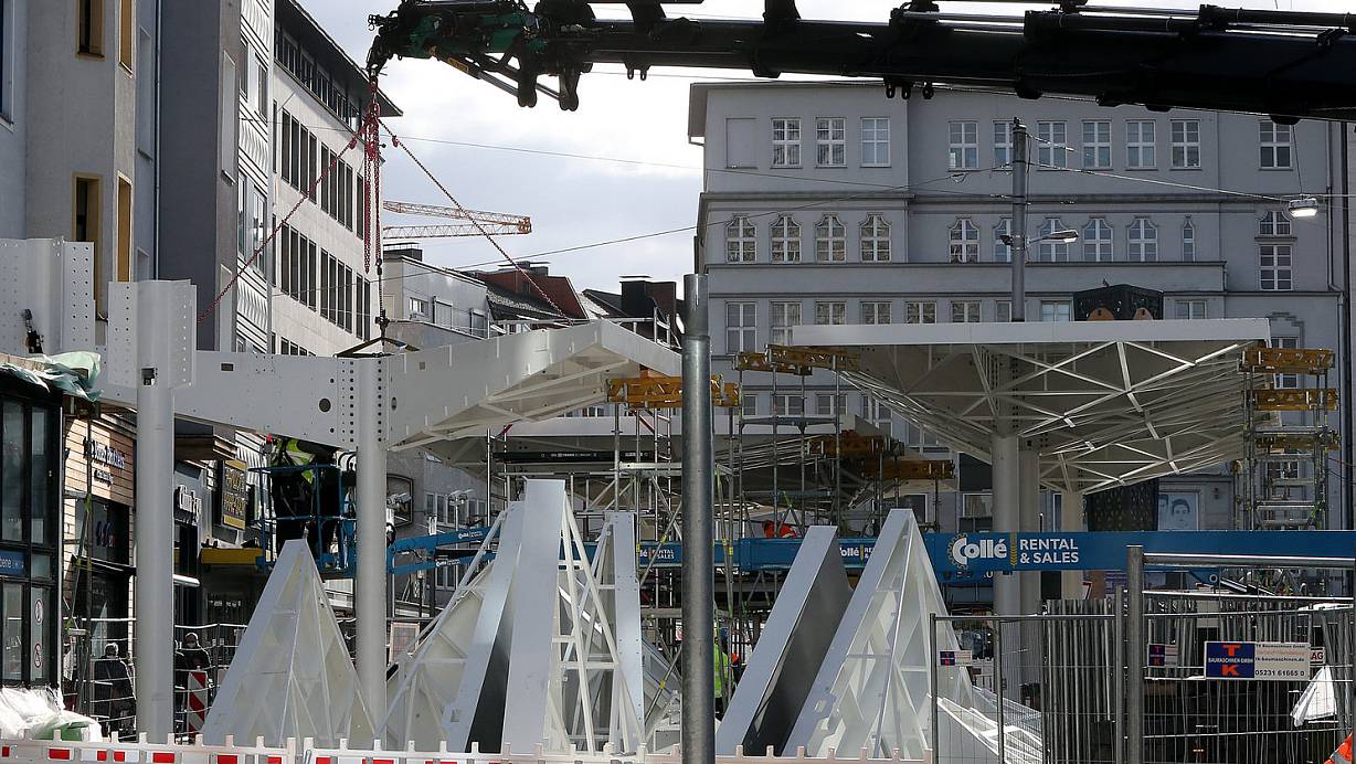 Zwar verzögert – aber der Aufbau der Haltestellendächer auf dem Jahnplatz geht weiter. Jetzt steht auch das erste der höheren vorderen Dächer, die über die Einstiegskante ragen. Ein Kran hebt die Dreiecke an, aus denen die Dächer zusammengesetzt sind. | © Wolfgang Rudolf