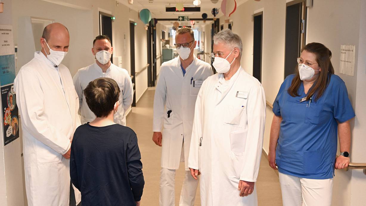 Max ist glücklich, dass die OP erfolgreich verlaufen ist. Jan Schulte am Esch, Hendrik Voßschulte, Martin Krüger, Winfried Bathlen und Franziska Wegener haben das im Team geschafft.  | © Evangelisches Klinikum Bethel