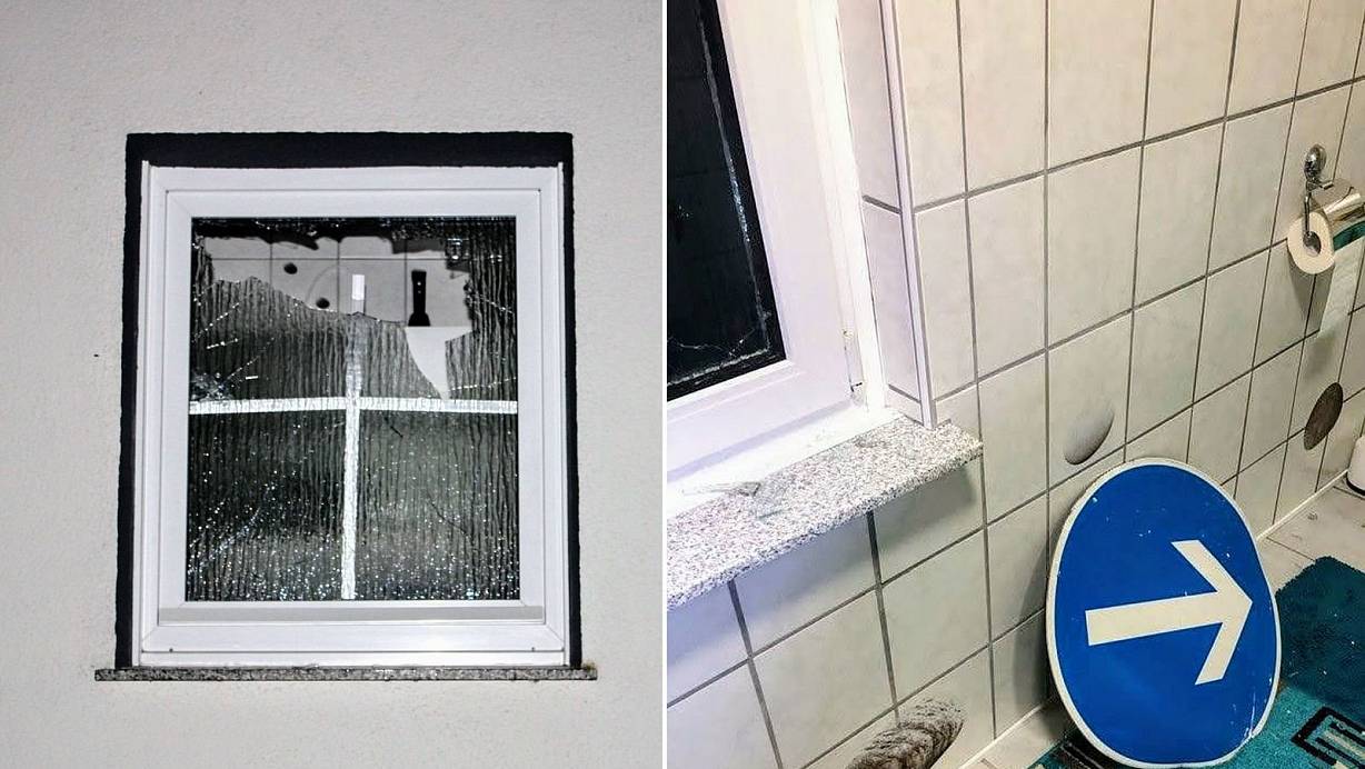 Das Schild durchschlug den oberen Teil des Fensters (l.) und landete dann neben dem Klo auf dem Boden. | © Polizei
