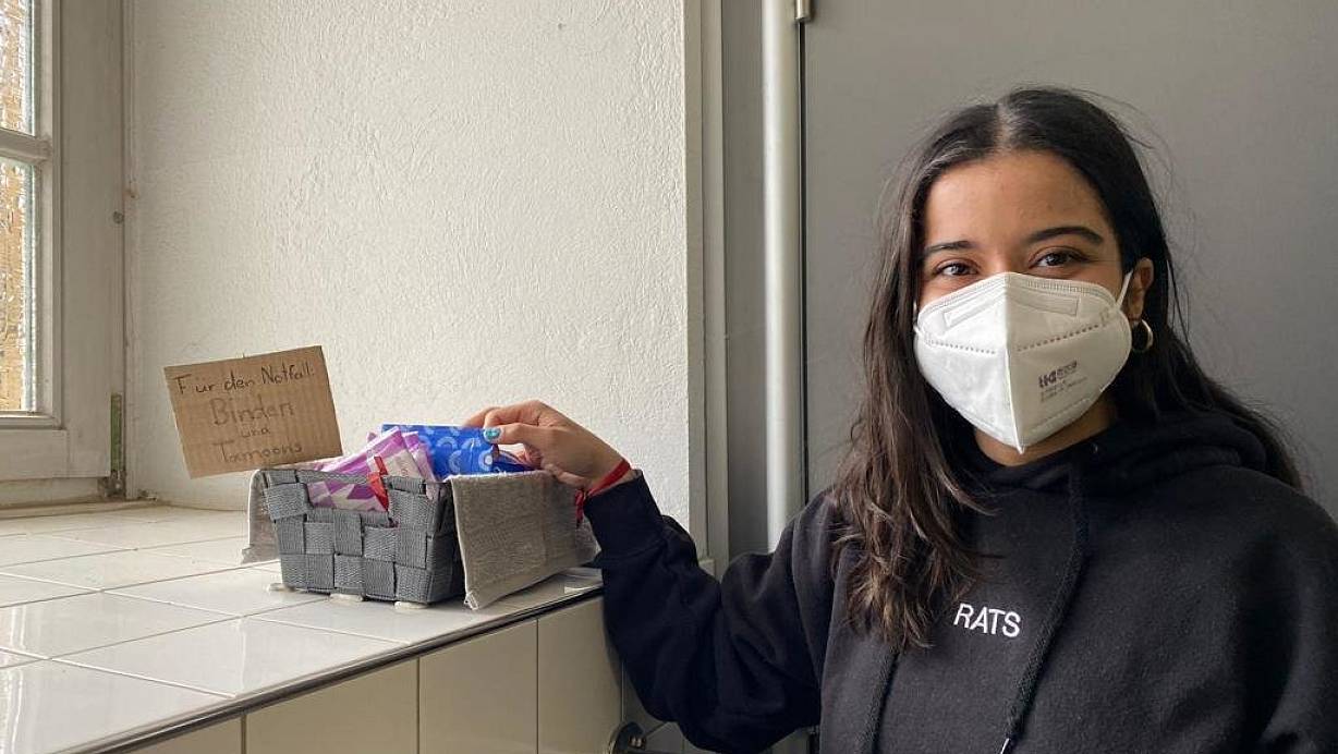Auf der Schultoilette am Ratsgymnasium gibt es seit einigen Monaten kostenlose Menstruationsprodukte. Das Projekt haben Schülersprecherin Aliya Kalirad (17) und ihre SV-Kollegen organisiert. | © privat