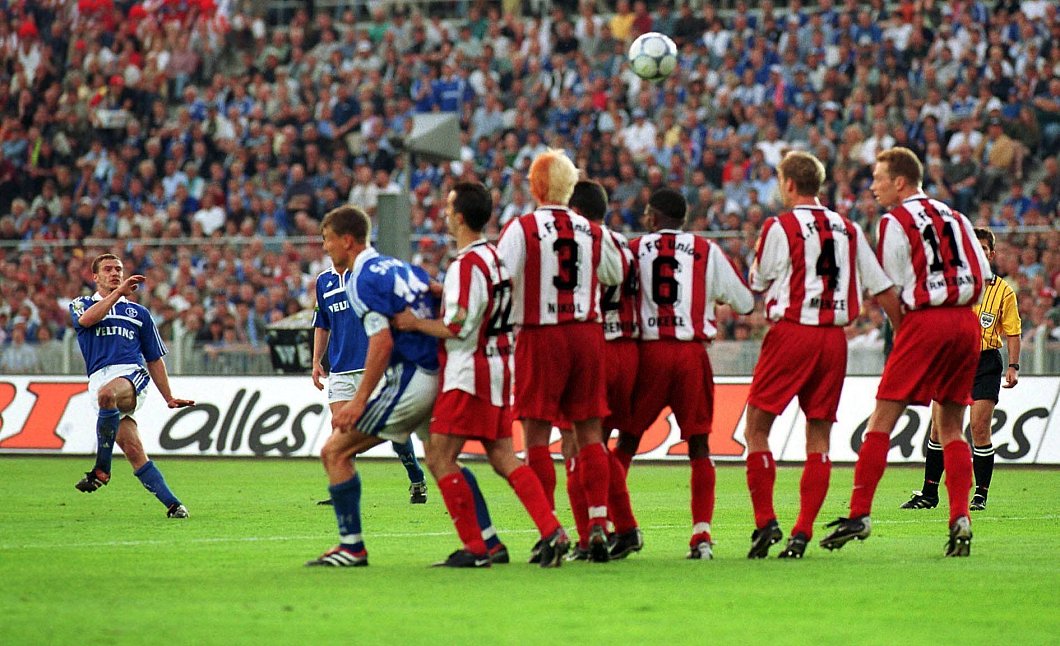 Vor 73.011 Zuschauern geht der „Meister der Herzen" als haushoher Favorit in das Spiel. Trotzdem ist sie den Schalkern anzusehen, „die Angst, am Ende wieder mit leeren Händen dazustehen", wie Böhme zugibt. „In der ersten Halbzeit haben wir in einigen Situationen echt Glück gehabt." Doch dann kommt die 53. Minute – und mit ihr die Erlösung: Ein Foul an Emile Mpenza bringt S04 einen Freistoß auf der halblinken Seite ein. „Eigentlich eine Megaposition für Andreas Möller", erinnert sich Böhme. Doch während Schalkes Spielmacher, ein Rechtsfuß, noch überlegt, ob er das lange oder kurze Eck anpeilen soll, hat Schlitzohr Böhme einen anderen, seinen eigenen Plan.