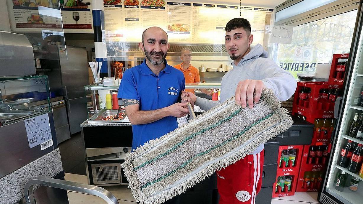Mit seinem Wischmopp attackierte Eray Ari (r.) den Maskenmann.  Sein Onkel Turan Ari eilt ihm zu Hilfe und riss dem Täter die Maske vom Gesicht. | © Wolfgang Rudolf