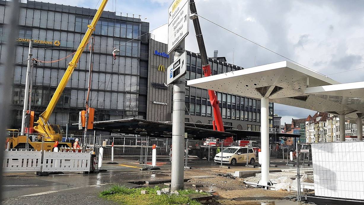 Jahnplatz-Umbau: Die neuen Haltestellendächer auf der Südseite stehen bereits, jetzt werden die alten auf der Nordseite abgerissen. | © NW