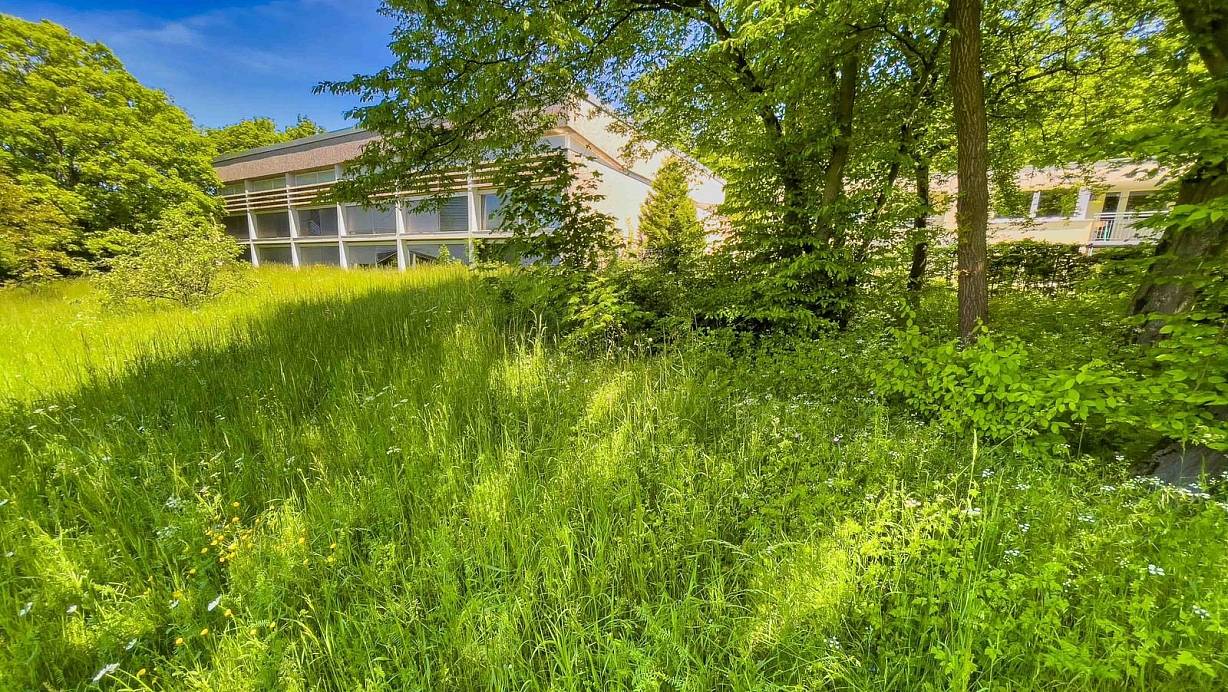 Fast überwuchert: die alte Sporthalle und die Hausmeisterhäuser, die ab September abgerissen werden.  | © Andreas Zobe