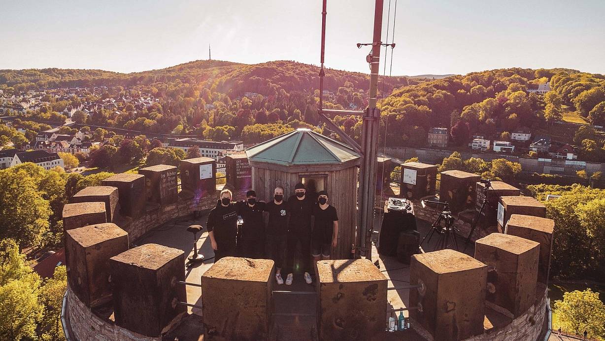 DJ Luke D. produziert hoch oben über der Stadt spektakuläre Aufnahmen für einen Internet-Stream. Am Samstag wird er ausgestrahlt. Die Spendeneinnahmen gehen an „Alarmstufe Rot“.