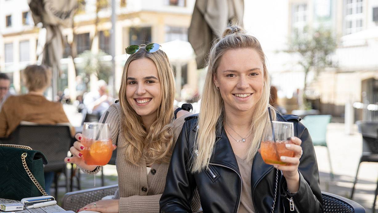 Hanna Tenhoff (20, rechts) und Charlotte Mahncke (22) genießen einen Longdrink im Außenbereich der Gastronomie Stahlberg | © Oliver Krato