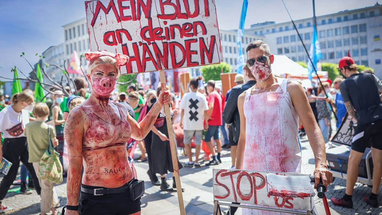 Eine breite Koalition verschiedener Tierschutz-Organisationen zog am Samstagnachmittag kunstblutbeschmiert und plakattragend durch die Stadt.