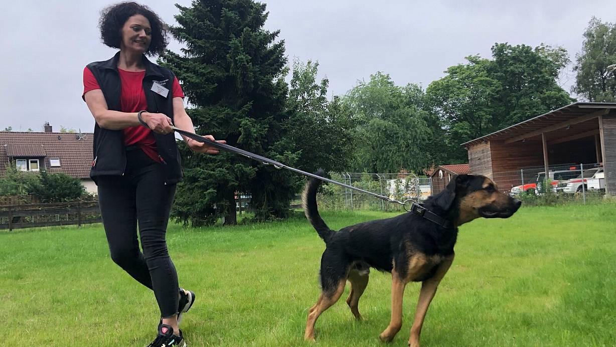Schäferhund-Malinois-Mix Chips, anderthalb Jahre jung und ungestüm, braucht sportliche Menschen, die ihn halten können. Viel interessanter als Tierheimleiterin Anja Langer am anderen Ende der Leine findet er all die aufregenden Gerüche, die ihn von allen Seiten locken. | © Silke Kröger