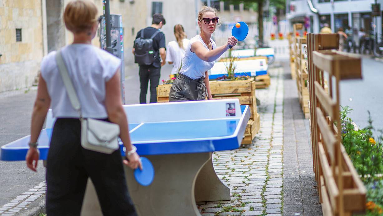 Katrin Schäfer (hinten) testet mit ihrer Freundin Susann Herrmann die Tischtennisplatten aus. Beide finden die Idee super. | © Sarah Jonek Fotografie