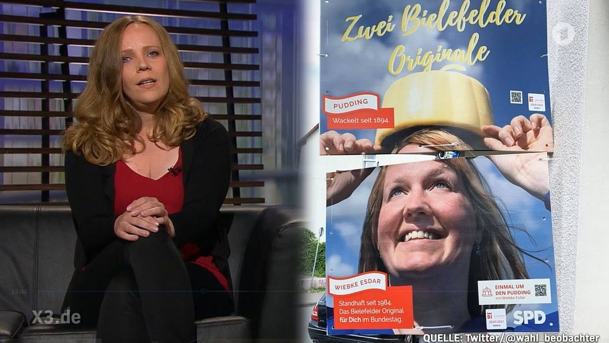 Sarah Bosetti vom Satiremagazin „Extra 3“ macht sich über das Pudding-Plakat von Wiebke Esdar (SPD) lustig. | © Screenshot: X3.de