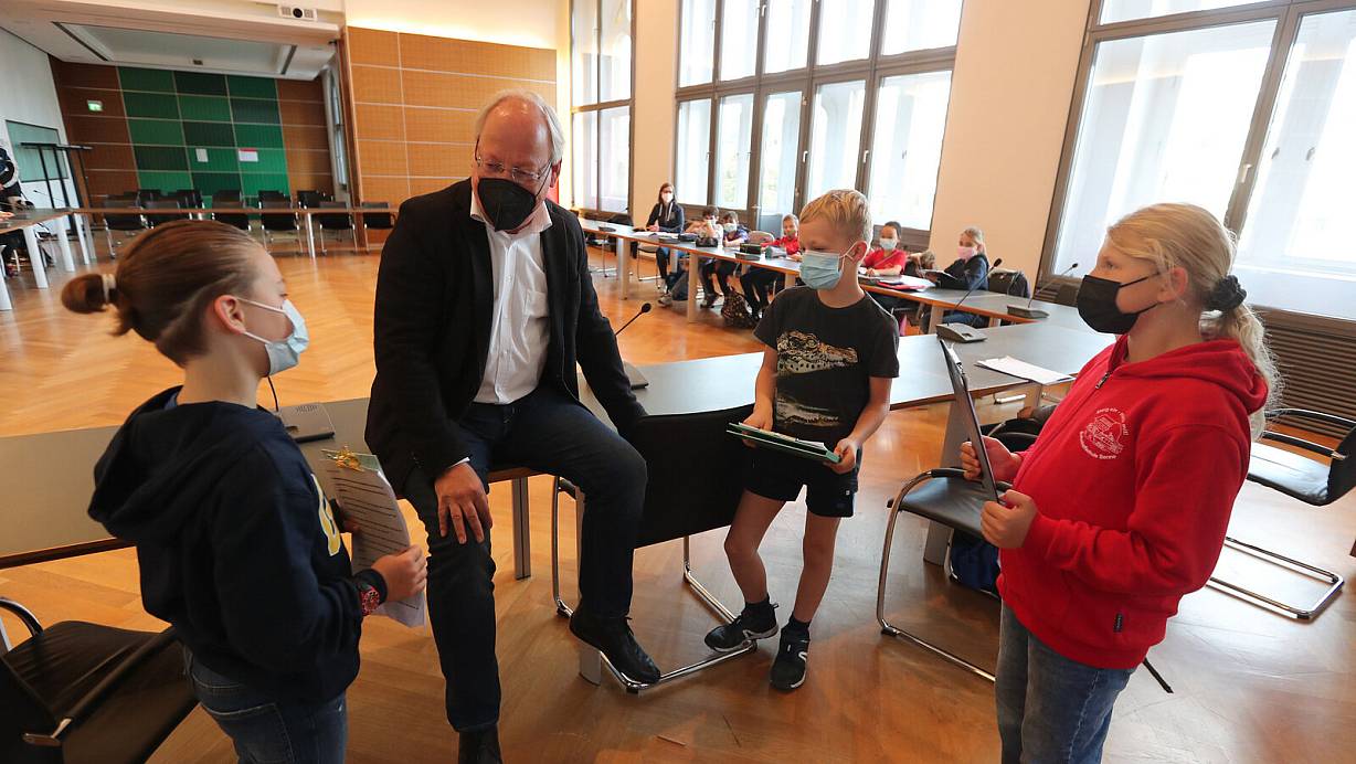 "Warum müssen wir immer noch Masken tragen?", wollen Viertklässler von Pit Clausen wissen. Und auch zu anderen Themen stellen sie im Rathaus kritische Fragen. „Was macht einen guten Politiker aus?“, wollen sie wissen.