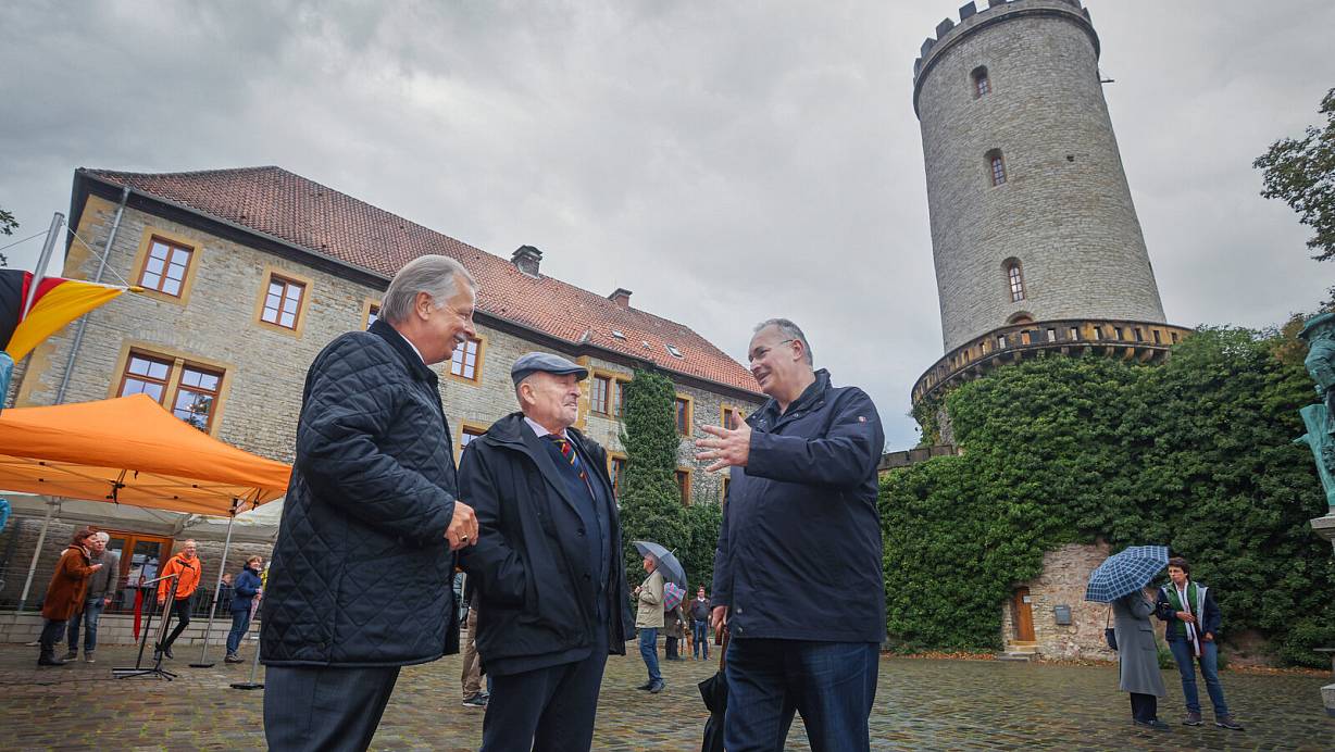 Am Fuße des zur Feier des Tages Schwarz-Rot-Gold beflaggten Turmes der Sparrenburg begrüßen der CDU-Kreisvorsitzende Andreas Rüther (l.) und der Landtagsabgeordnete Ralf Nettelstroth (r.) ihren Gastredner Rainer Eppelmann. Foto: Sarah Jonek | © Sarah Jonek Fotografie
