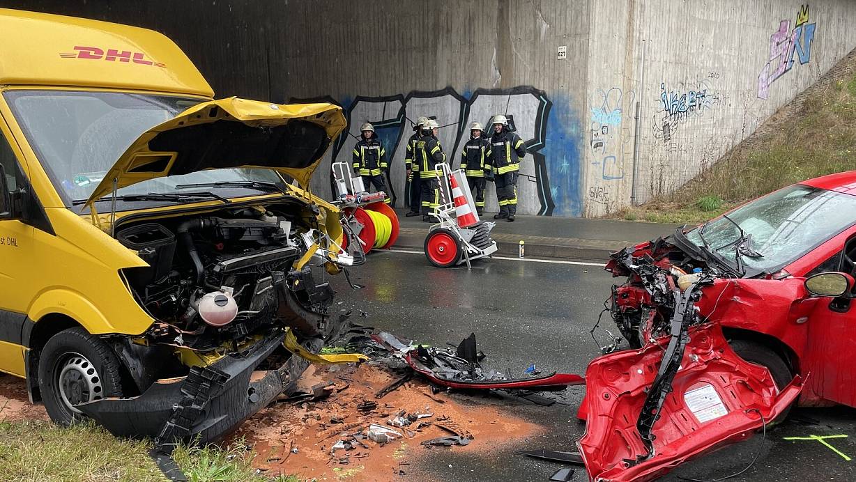Ein Pkw und ein Klein-Lkw sind im Bereich der A-2-Unterführung frontal zusammengestoßen. Vorbildlicher Einsatz von Ersthelfern.