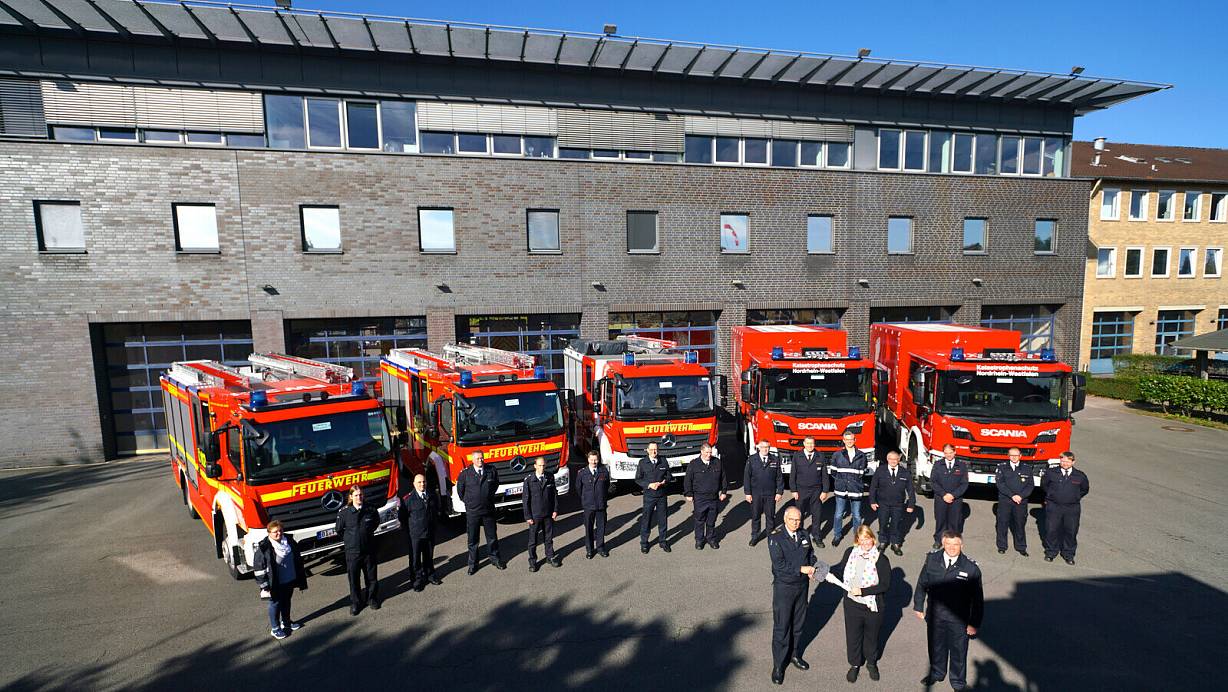 Fünf nigelnagelneue Feuerwehrfahrzeuge sind ab sofort im Einsatz für die Löschabteilungen der Freiwilligen Feuerwehr Hoberge-Uerentrup, Senne, Kupferhammer, Milse und Innenstadt (v.l.). | © Peter Unger