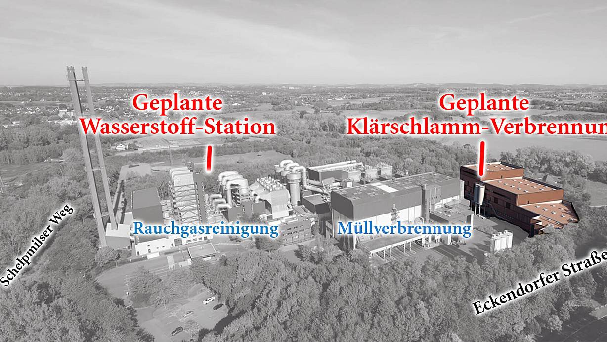 Zwei Großprojekte plant die MVA: Die Klärschlammverbrennung, deren Abgase mit in die Rauchgasreinigung gehen, und auf dem Nachbargrundstück die Wasserstoff-Station für MoBiel-Testbusse. | © MVA/Thomas Löhrig (Bearbeitung)