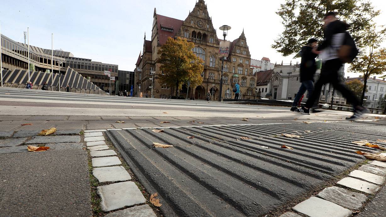 Überall in der Stadt sind auffällige Pflastersteine - wie diese anthrazitfarbenen mit breiten Rippen vor dem Alten Rathaus - verlegt. Doch was dem einen hilft, stört andere. | © Wolfgang Rudolf