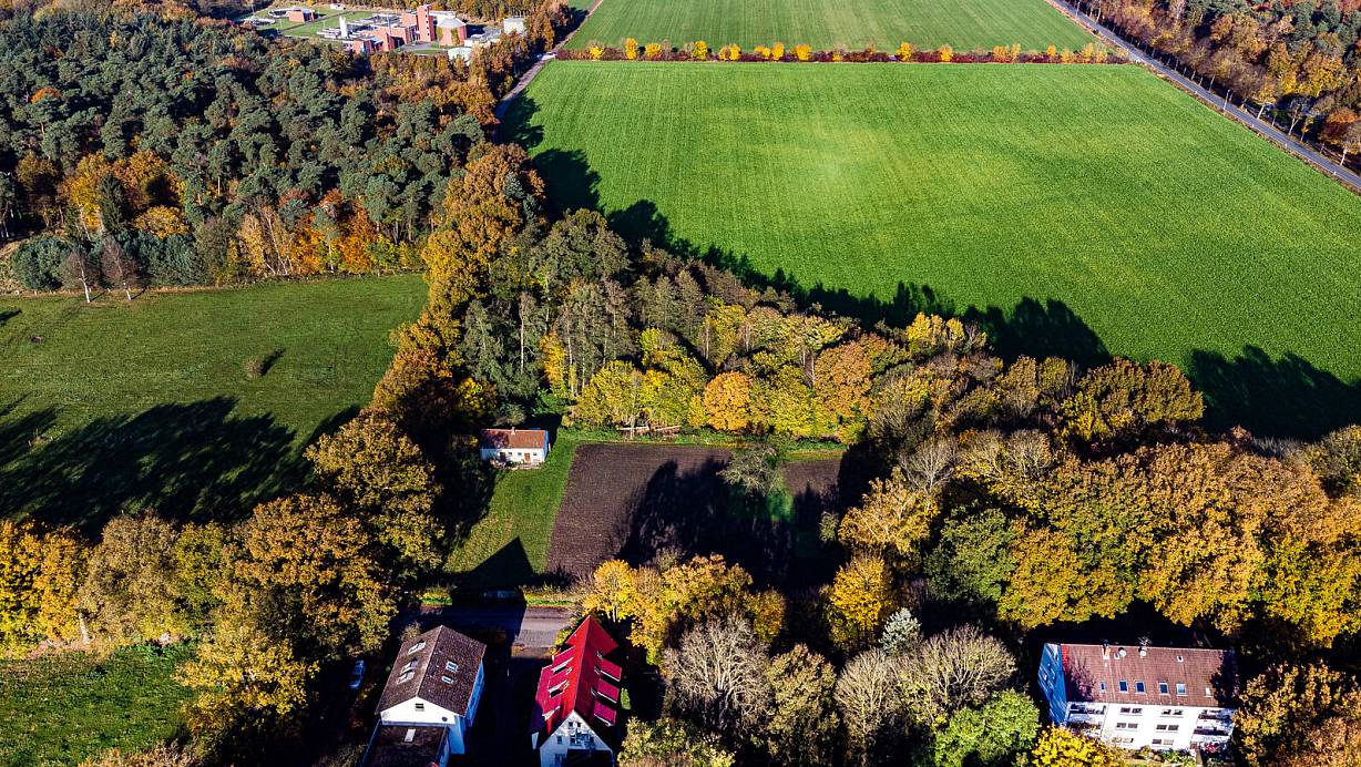 Aus der Luft ist sehr gut der geplante Standort der Waldkita auf Gut Wilhelmsdorf zu sehen. Das Wiesengrundstück (mit altem Hühnerstall) liegt gegenüber von Häusern der von Bodelschwinghschen Stiftungen. Aber weil dort alles Landschaftsschutzgebiet ist, darf die Kita dort nicht ihren Sitz haben. | © Stefan Gerold