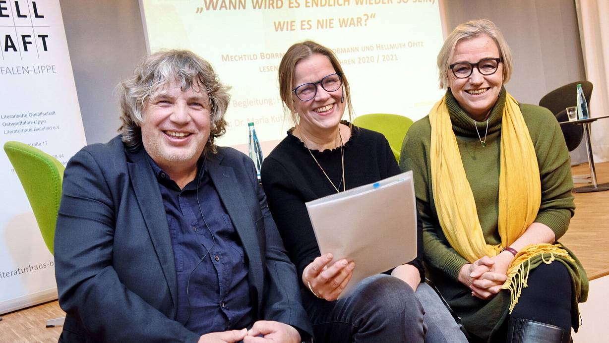 Drei auf der Lesebühne: Hellmuth Opitz, Antje Doßmann und Mechtild Borrmann (v.l.) hatten einiges zu sagen und zu schreiben während des Shutdowns in der Coronakrise. Mit neuer Texten beeindruckten und amüsierten die Bielefelder Autoren ihr Publikum. | © Barbara Franke