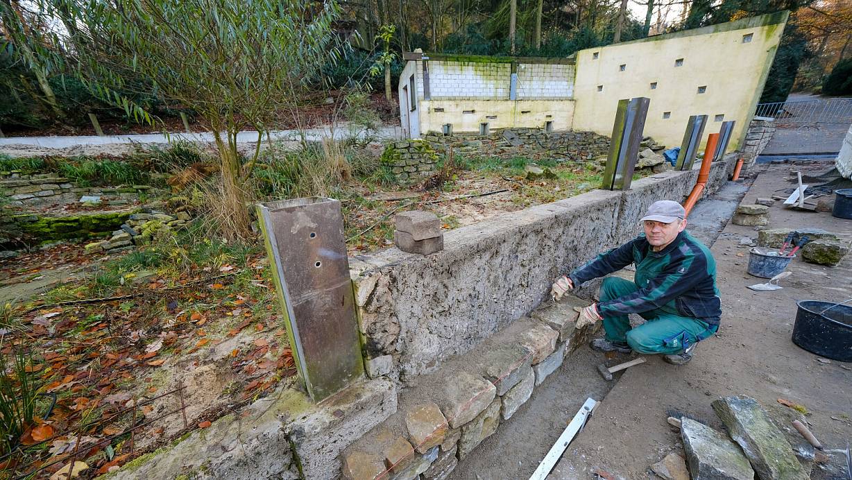 Tierpark-Mitarbeiter Abram Regier verkleidet die äußere Mauer der neuen Anlage mit Natursteinen. | © Foto: Andreas Zobe/NW
