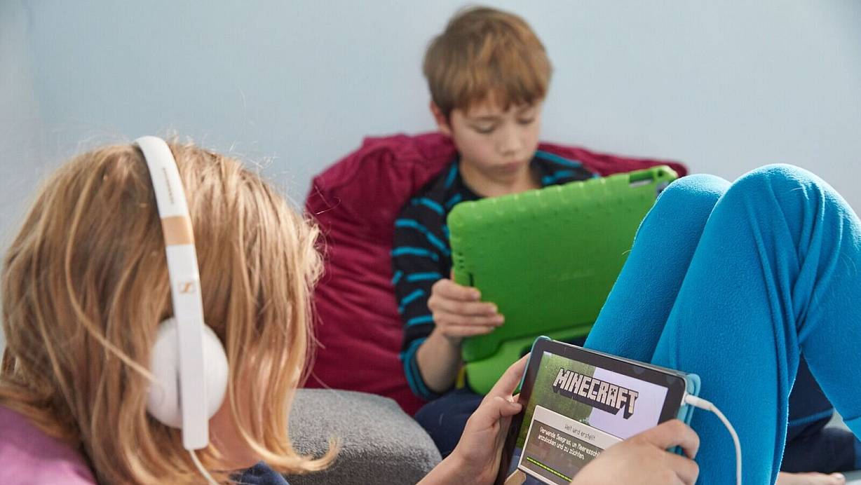 Philip (l.) und Mingus spielen auf ihren iPads das Open-World-Computerspiel Minecraft. Ein Spiel mit vielen positiven Eigenschaften. Doch viele Kinder und Jugendliche treffen sich weniger mit Freunden, weil sie immer mehr zocken. | © picture alliance/dpa