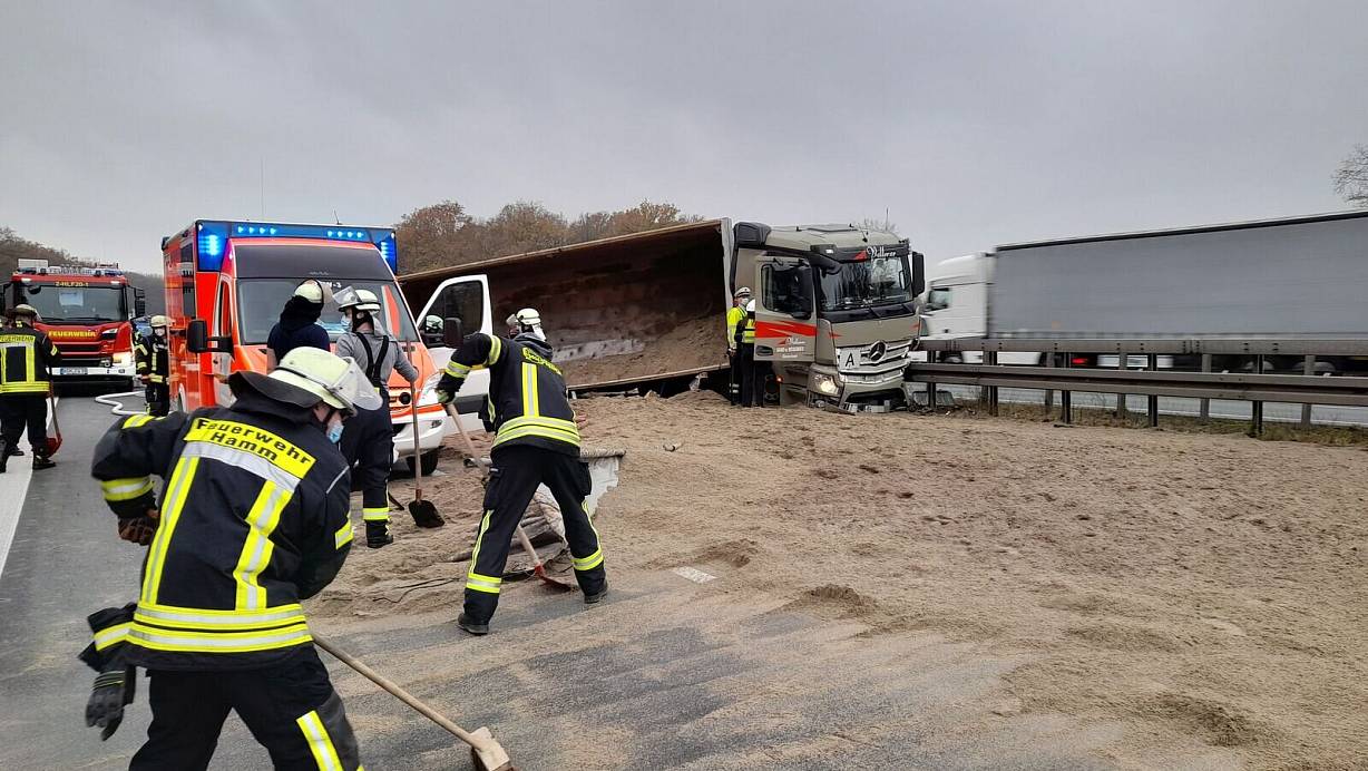 40 Tonnen Sand landete nach dem Unfall auf alle Spuren der A2. Die Feuerwehr ist über Stunden im Einsatz.  | © Lothar Zimmermann