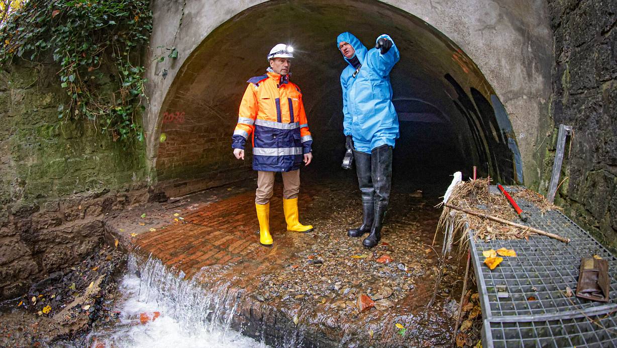 Der Lutter-Kanal vor Stauteich I: Bauleiter Mehdi Karimi und Andreas Kuhlemann vom Umweltbetrieb untersuchen die Wände des drei Meter breiten und zwei Meter hohen Bauwerks, das von innen zur Sanierung ausgekleidet werden soll. | © Mike-Dennis Müller / www.mdm.photo