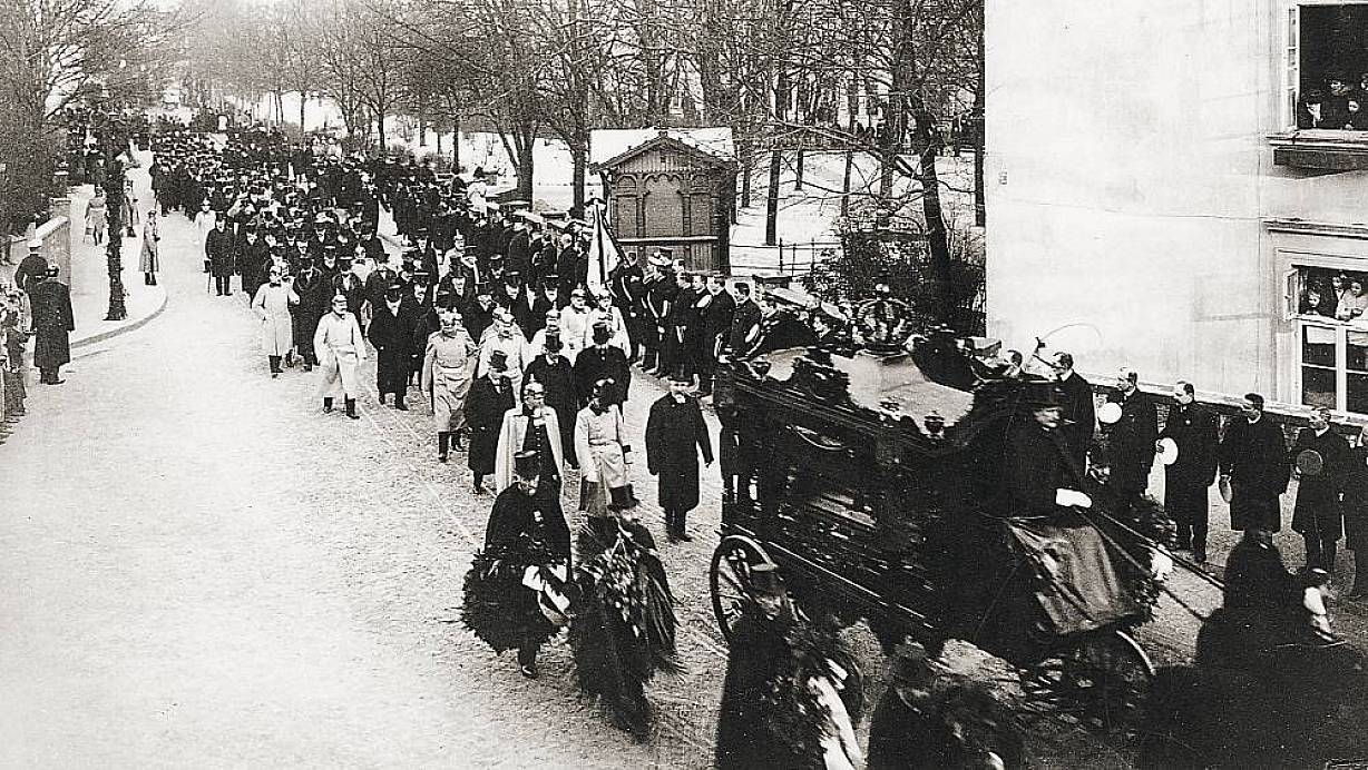 Hinter dem Sarg: Kaiser Wilhelm II. und Prinz Heinrich folgten bei schneidender Kälte dem Sarg des kaiserlichen Erziehers Georg Hinzpeter. Der war am 28. Dezember 1907 in Bielefeld gestorben und wurde am 2. Januar 1908 auf dem Johannisfriedhof begraben. | © Stadtarchiv Bielefeld