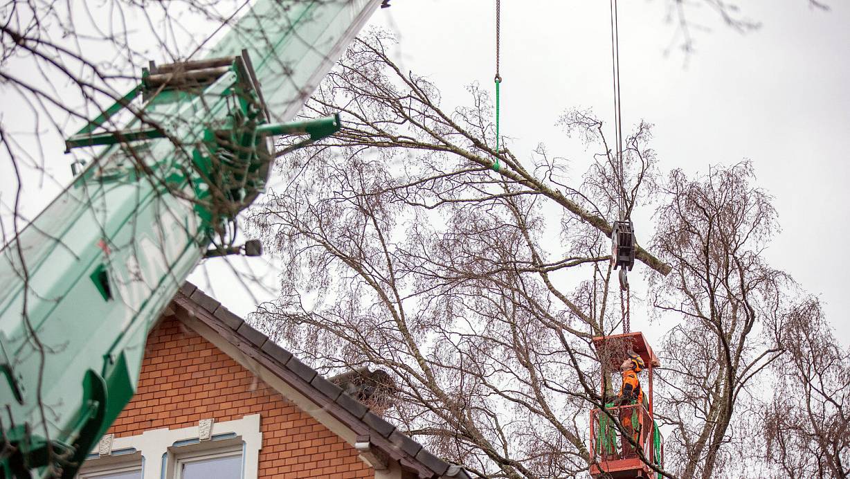 Eine 55 Jahre alte Birke in der Wertherstraße fällt während des Sturmes an ein benachbartes Haus. Um den Baum zu bergen, muss auf besondere Mittel zurückgegriffen werden.