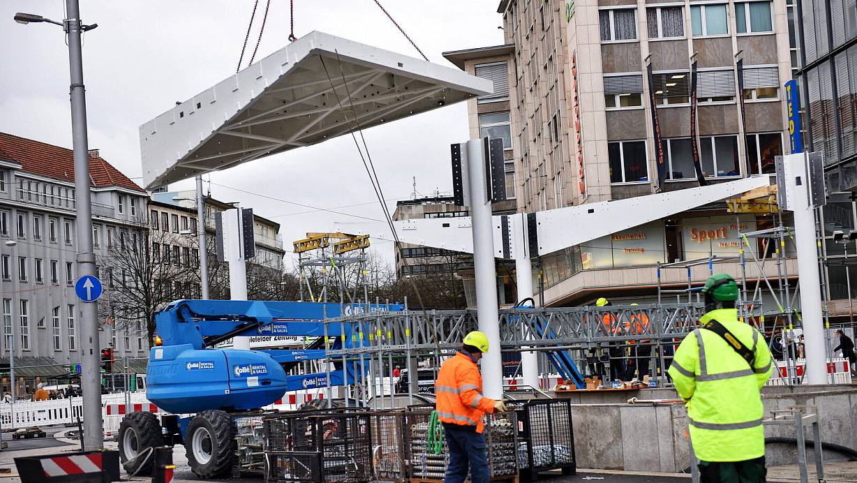 Die neuen Haltestellen-Dächer werden montiert: Der Jahnplatz-Umbau wird erneut teurer. | © Barbara Franke