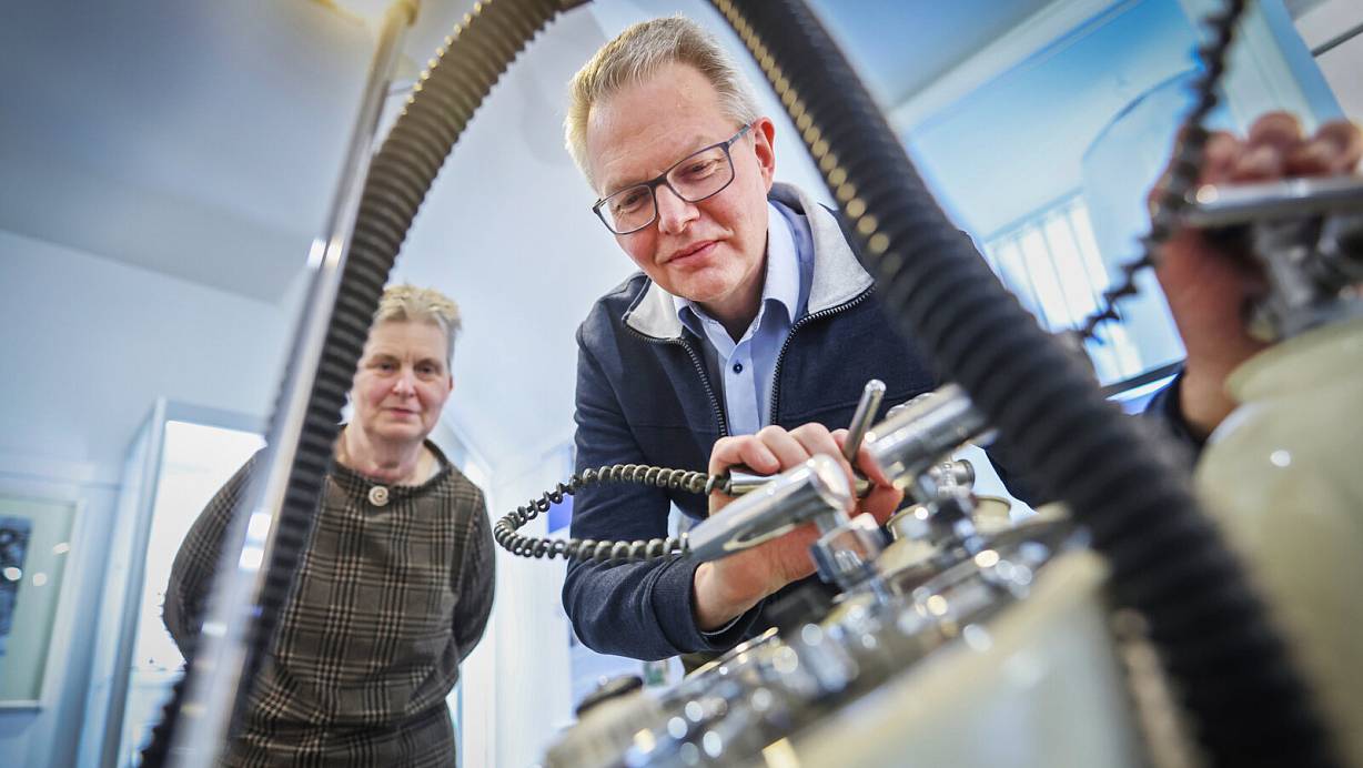 Wilfried Witte, Oberarzt für Anästhesiologie, bedient das Lachgas-Analgesie und Narkosegerät von 1957 zur Unterdrückung des Wehenschmerzes. Die Leiterin der Historische Sammlung Bethel, Bärbel Bitter, schaut zu. | © Sarah Jonek Fotografie