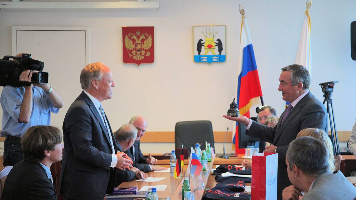 Vor zehn Jahren wurde Bielefelds Oberbürgermeister Pit Clausen feierlich vom damaligen Bürgermeister von Welikij Nowgorod, Juri Iwanowitsch Bobryschew, empfangen. Aktuell wäre so ein Treffen praktisch undenkbar. Foto: Archiv | © nicht bekannt