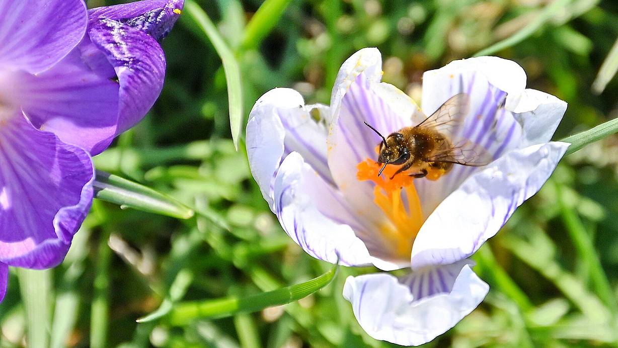 Die blühenden Krokusse auf dem Alten Friedhof am Jahnplatz dienen Wildbienen schon jetzt als erste Nahrungsquelle zum Jahresanfang. | © Barbara Franke