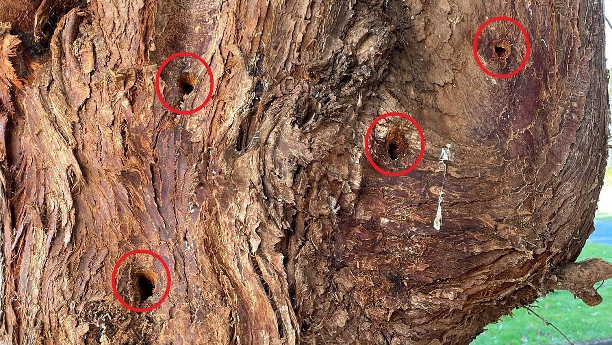 Mehrere akkurat gebohrte Löcher weist der Lebensbaum auf, in die der Täter eine Substanz gefüllt hat, die giftig sein dürfte. | © Polizei