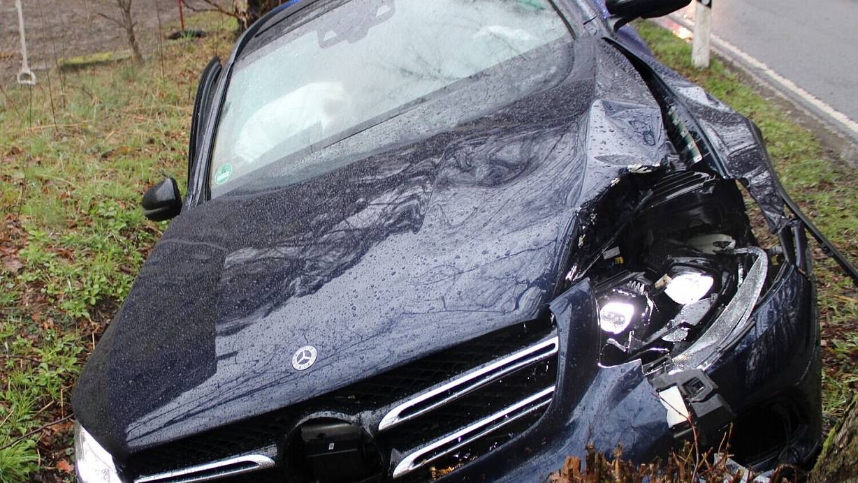 Der Mercedes landete trotz gerader Strecke rechts im Graben und wurde dort von einem Baum jäh gestoppt. | © Polizei