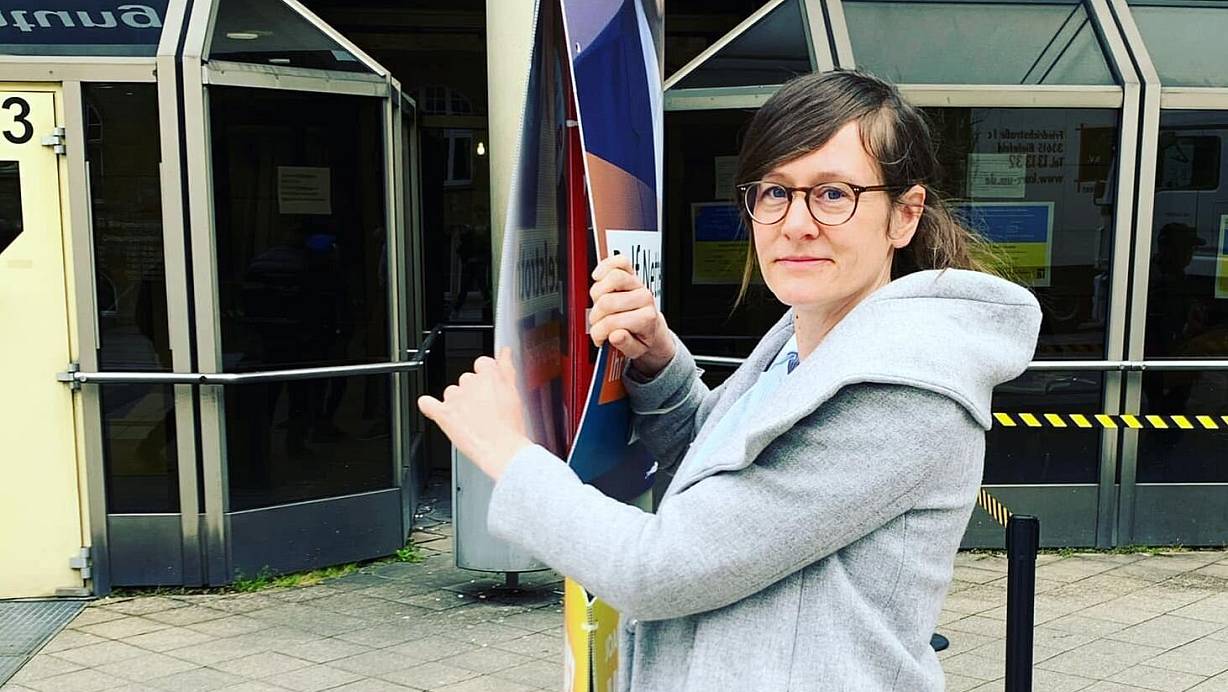 Christina Kampmann vor dem Bielefelder Rathaus am Plakat. | © privat