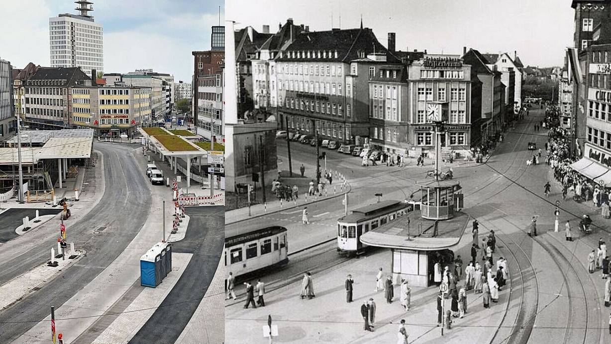 Vergleich Jahnplatz 2022 und 1955. | © Barbara Franke/Stadtarchiv Bielefeld