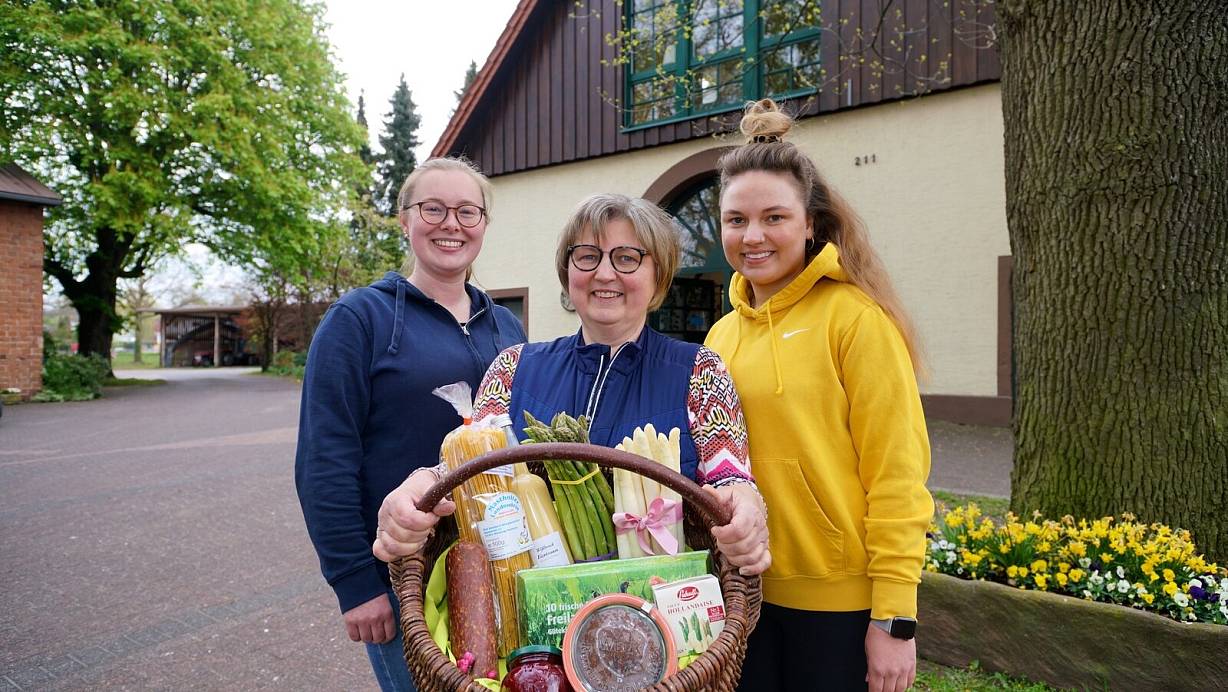 Frauenpower: Heike Wißbrock, umrahmt von Tochter Pauline (rechts) und der Freundin von Sohn Johannes, Ida Großemaestrup auf der anderen Seite, die ebenfalls mithilft, wenn sie gebraucht wird. Der Korb ist gefüllt mit dem aktuellen Ladenangebot: von Spargel über Marmelade und Wildwurst, Schokokuchen und Nudeln bis hin zu den hofeigenen Eiern. | © Peter Unger