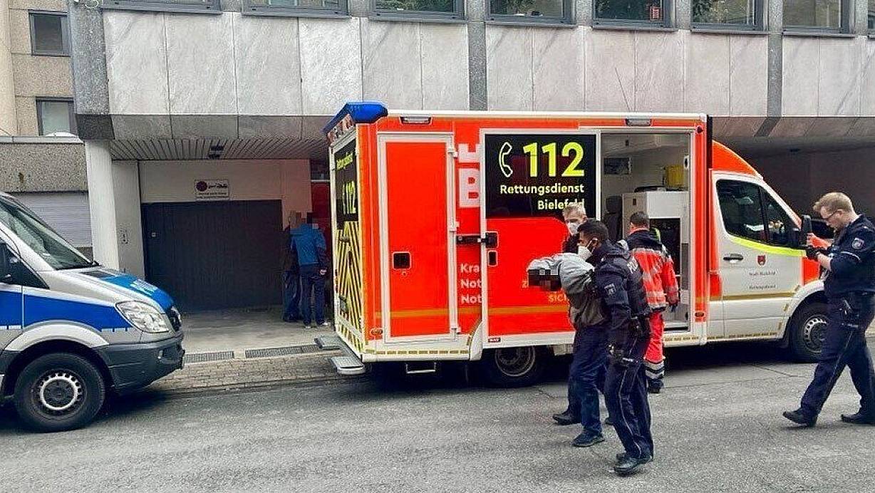 Polizisten führen den Tatverdächtigen im Oktober nach der Behandlung im Rettungswagen ab. | © Jens Reichenbach