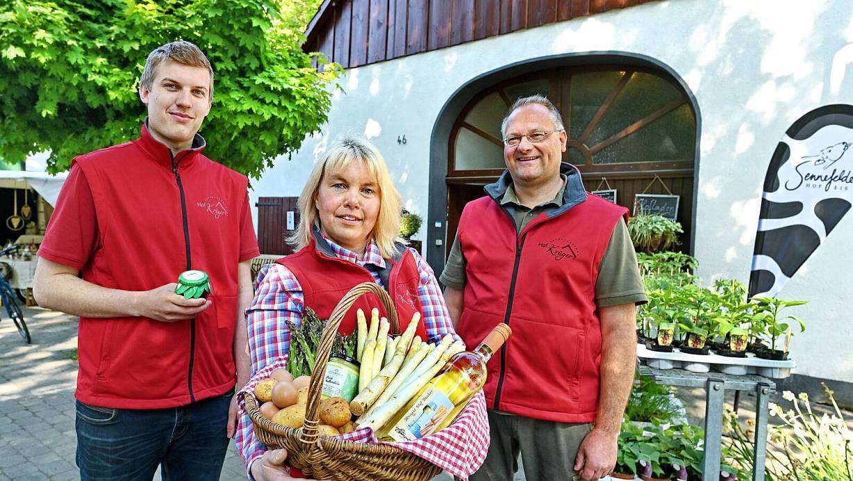 Frederic Krüger (l.), Mutter Simone und Hofbesitzer Detlef Krüger sind das Team hinter Hof Krüger im Bielefelder Süden. | © Barbara Franke