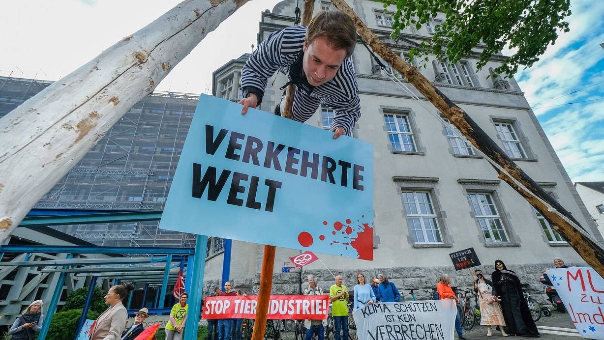 Protest-Aktion am Bielefelder Landgericht: Mann hängt kopfüber am Galgen