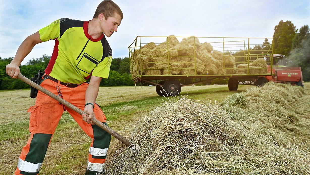 Maximilian Köhn schiebt die Haufen sauber zu einer langen Reihe zusammen, damit die Presse (hinten) sie gut anfahren und zu Ballen pressen kann. | © Barbara Franke