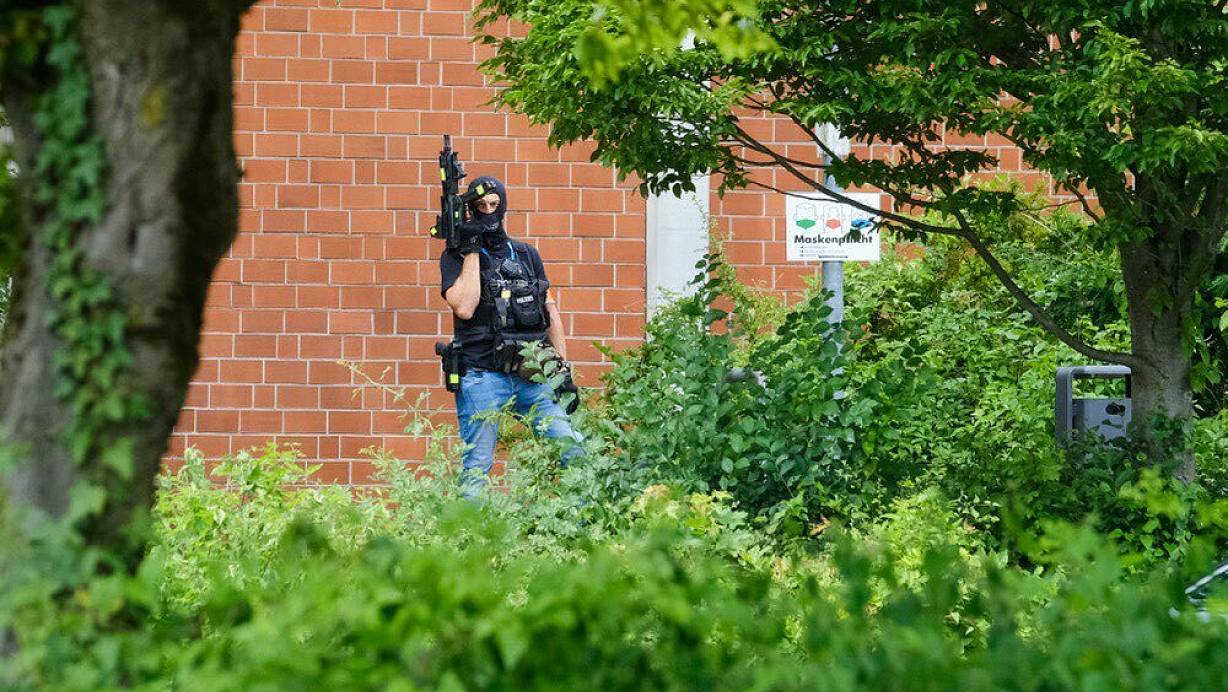 Ein schwer bewaffneter SEK-Beamter auf Position am Schulgebäude. | © Andreas Zobe