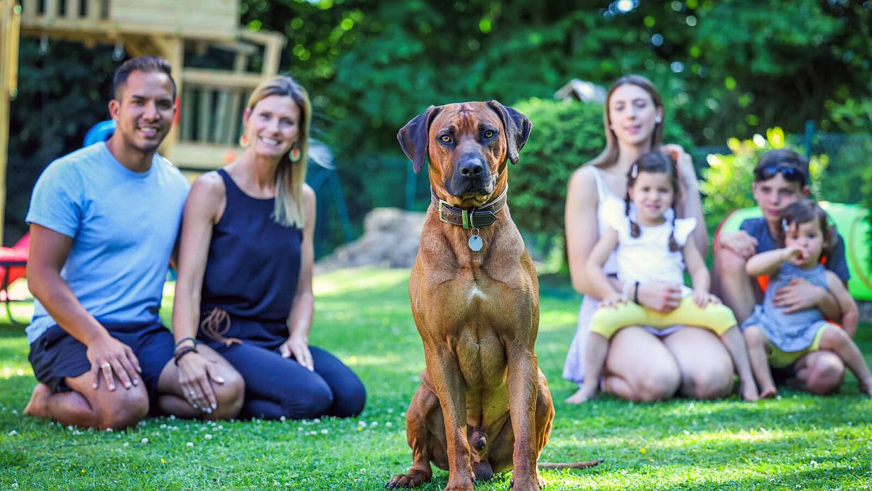 Der stolze Gewinner, immer mittendrin, cool und superlieb: Rhodesian Ridegeback Simba (3). Im Hintergrund seine Familie, Bastian, Bianca, Michelle (17), Catalina (3), Mitja (10) und Leonor (1) Schmitz (v.l). | © Sarah Jonek