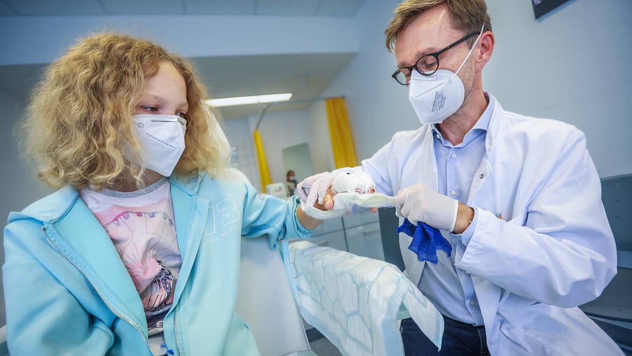 Chefarzt Onno Frerichs schaut sich an, wie die Wunde bei Emma verheilt. Bei einem Unfall mit einem Pferd waren zwei Finger der linken hand fast komplett abgetrennt worden. | © Sarah Jonek
