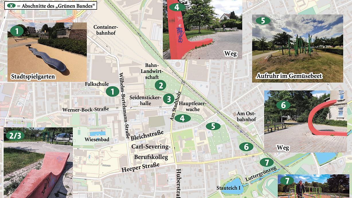Abschnitt 1 des "Grünen Bandes" im Osten: Gepflasterte Wege verbinden Stationen wie die Spielplätze. | © Stadt/Schultheiss/Jonek/NW
