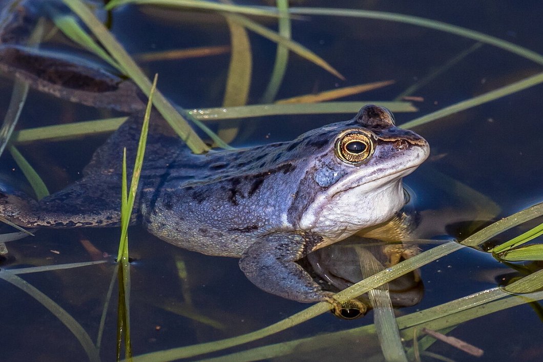 Amphibien, bei uns also Frösche, Kröten, Molche und Salamander, sind bei der Larvenentwicklung auf Wasser angewiesen. Zunehmende Dürre und frühzeitiges Austrocknen kleinerer Gewässer kann deshalb zum Totalverlust ganzer Populationen führen. Seltene Arten wie der Moorfrosch sind besonders bedroht. In der Paarungszeit im zeitigen Frühling sind die Männchen hellblau gefärbt und versuchen mit blubbernden Geräuschen die Weibchen zu beeindrucken. Im Oppenweher Moor in der Nähe von Rahden kann man das noch erleben. Trocknen die flachen Moortümpel aus, bevor die Kaulquappen sich zu kleinen Fröschen entwickelt haben, ist das Schicksal der Moorfrösche besiegelt.
