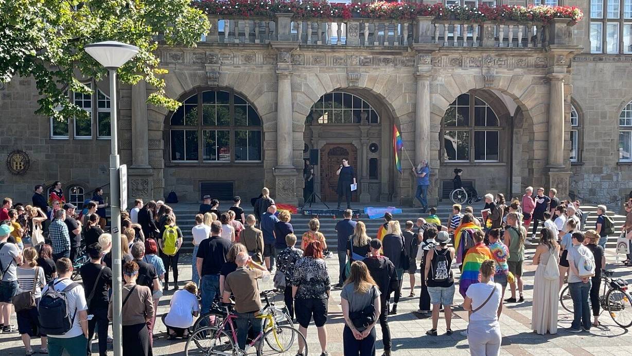 Demo gegen queerfeindliche Gewalt am Bielefelder Rathaus