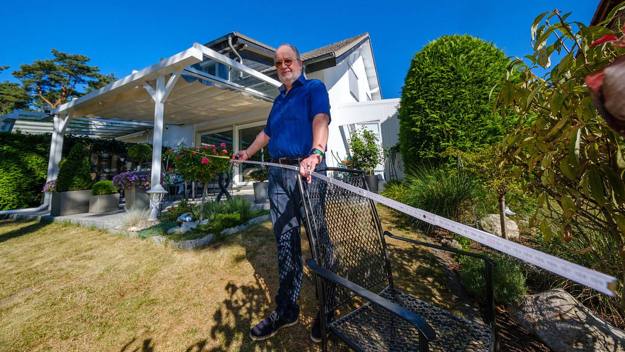 Meinhard Utecht mit Zollstock im eigenen Garten. Das Abstandsgebot zum Nachbarn verhindert die Investition in eine Wärmepumpe. | © Andreas Zobe