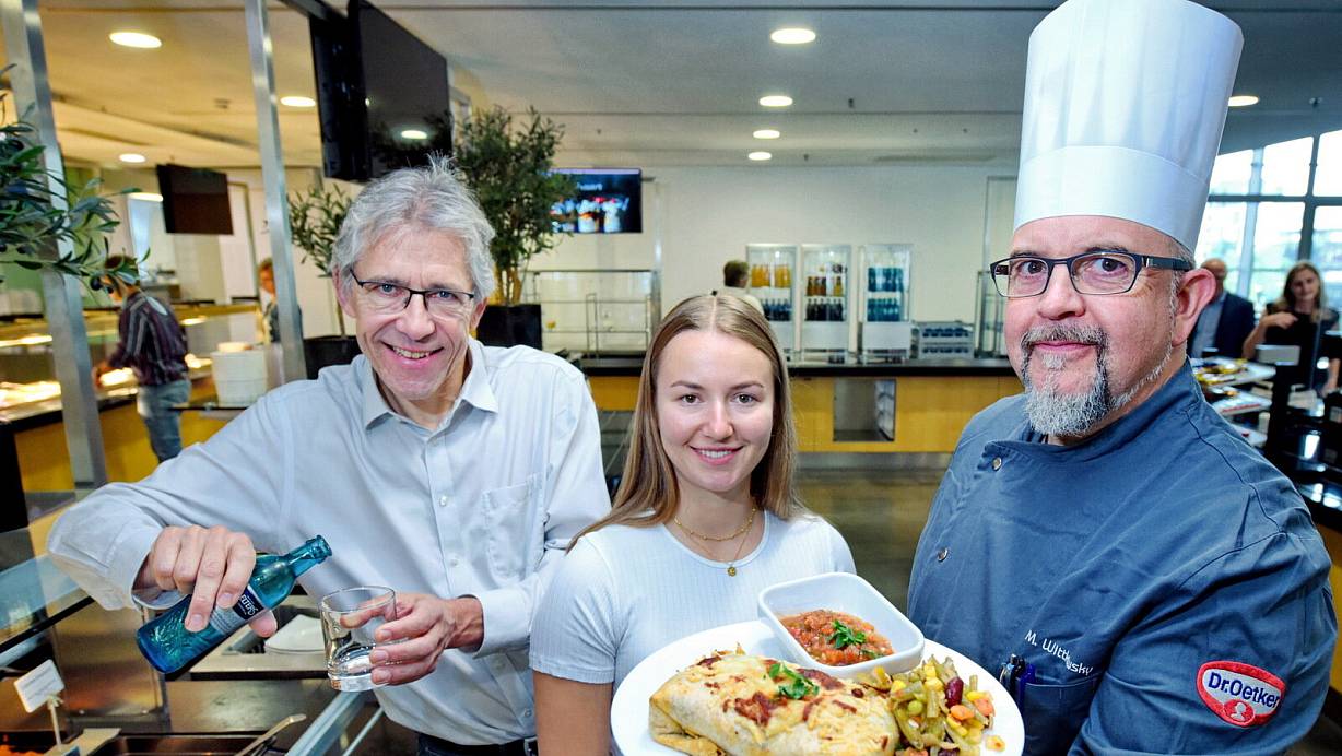 Leiter des Mitarbeiterservices, Andreas Fox (v.l) gießt sich ein Wasser ein. Daneben stehen Mitarbeiterin Ann-Katrin Uffmann und Küchendirektor Martin Wittkowsky. | © Barbara Franke